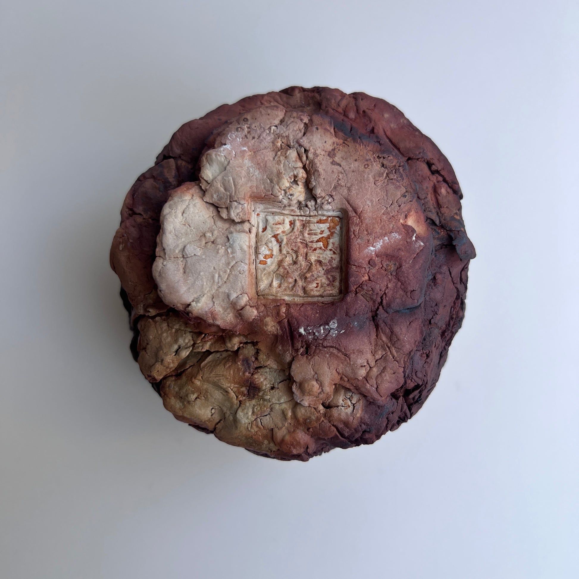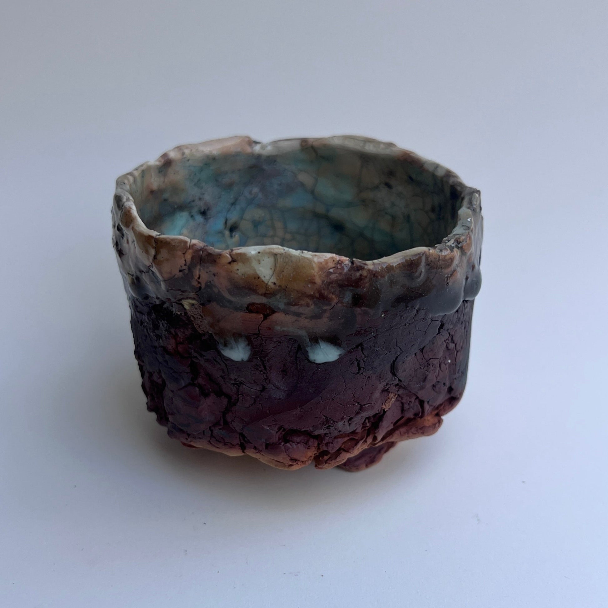 This bowl was carved out of about 800g of clay and then fired several times in various conditions. Some of the firings involved wood ash and salt and a copper band. The green shimmer on the surface of the of the object was created by melted copper. 9.5x9.5x7cm 320g