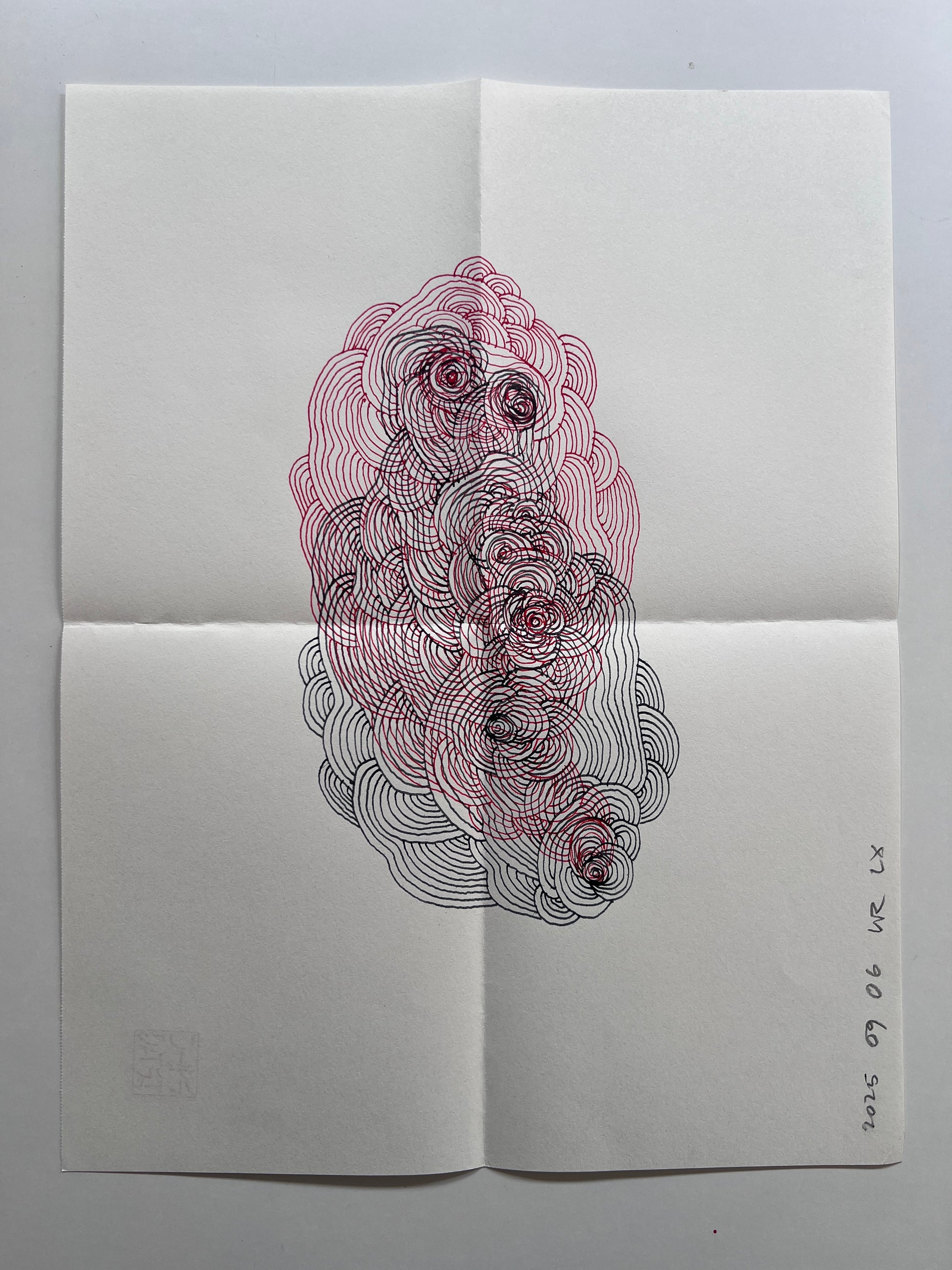 Mail art drawing (36x28cm when open, 18x14cm when mailed) drawn on 100g soft paper using pencil. This one is from the most recent mail art series.