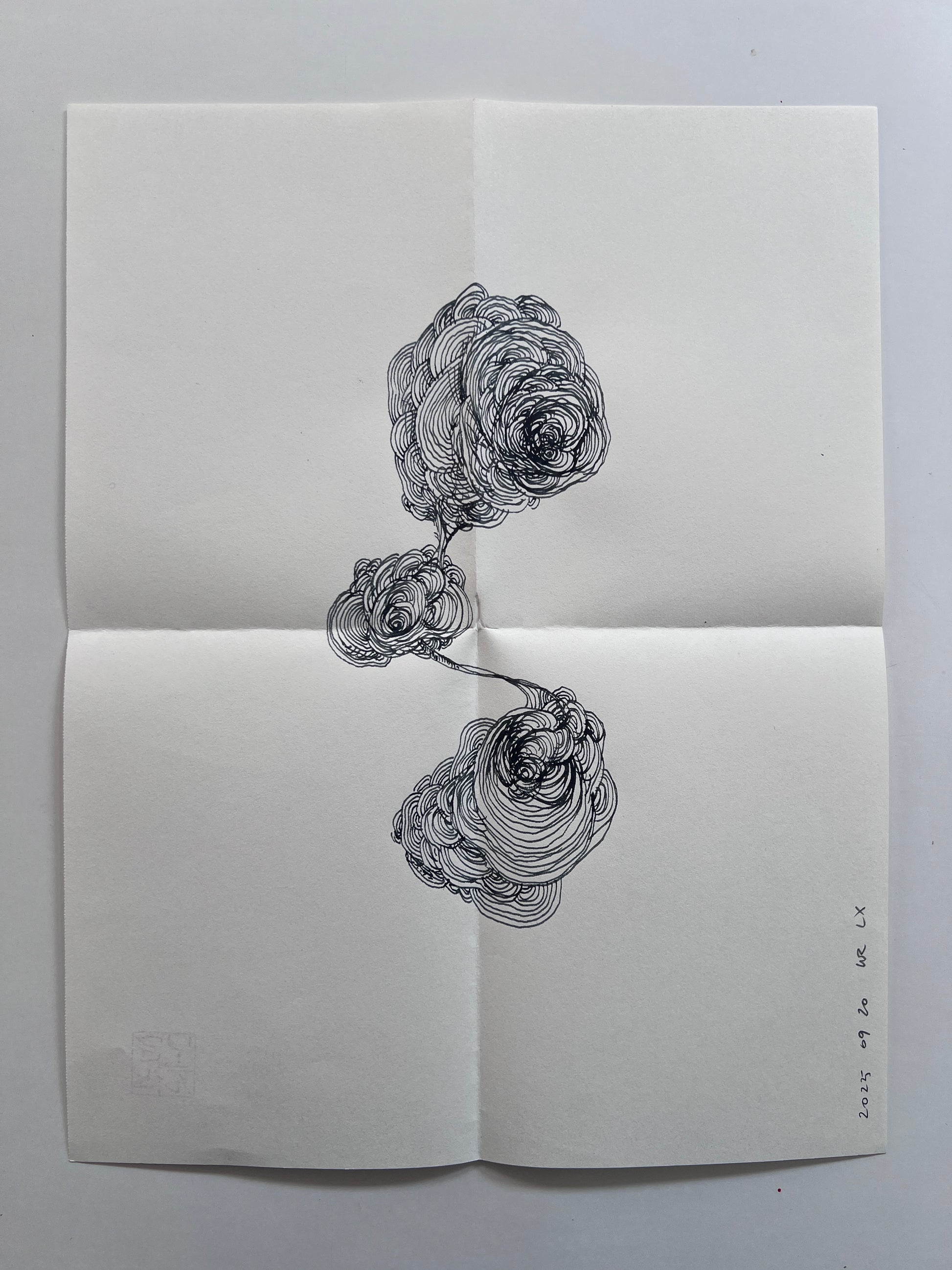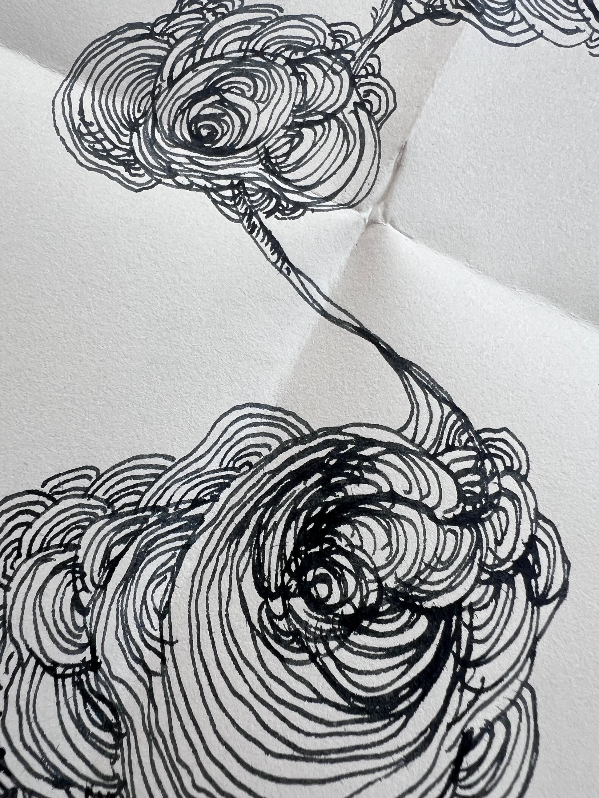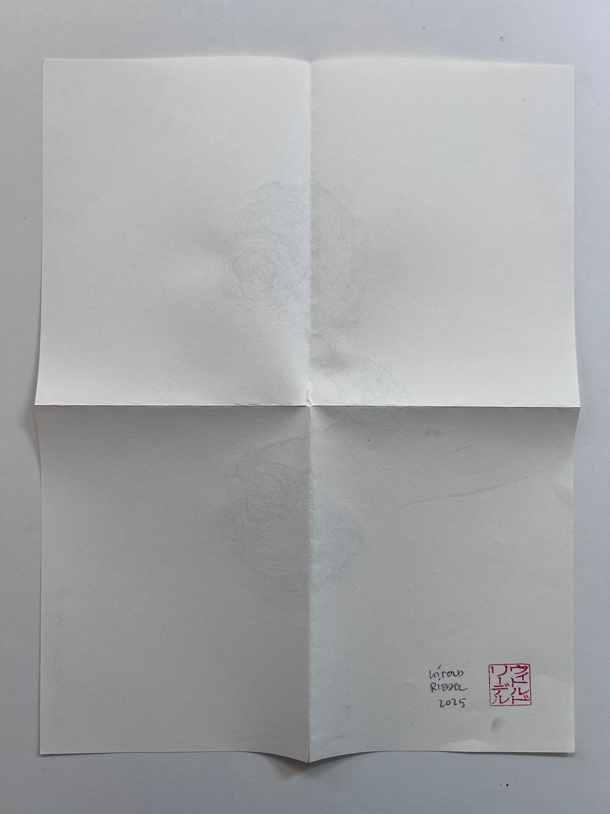 Mail art drawing (36x28cm when open, 18x14cm when mailed) drawn on 100g soft paper using ink. This one is from the most recent mail art series.