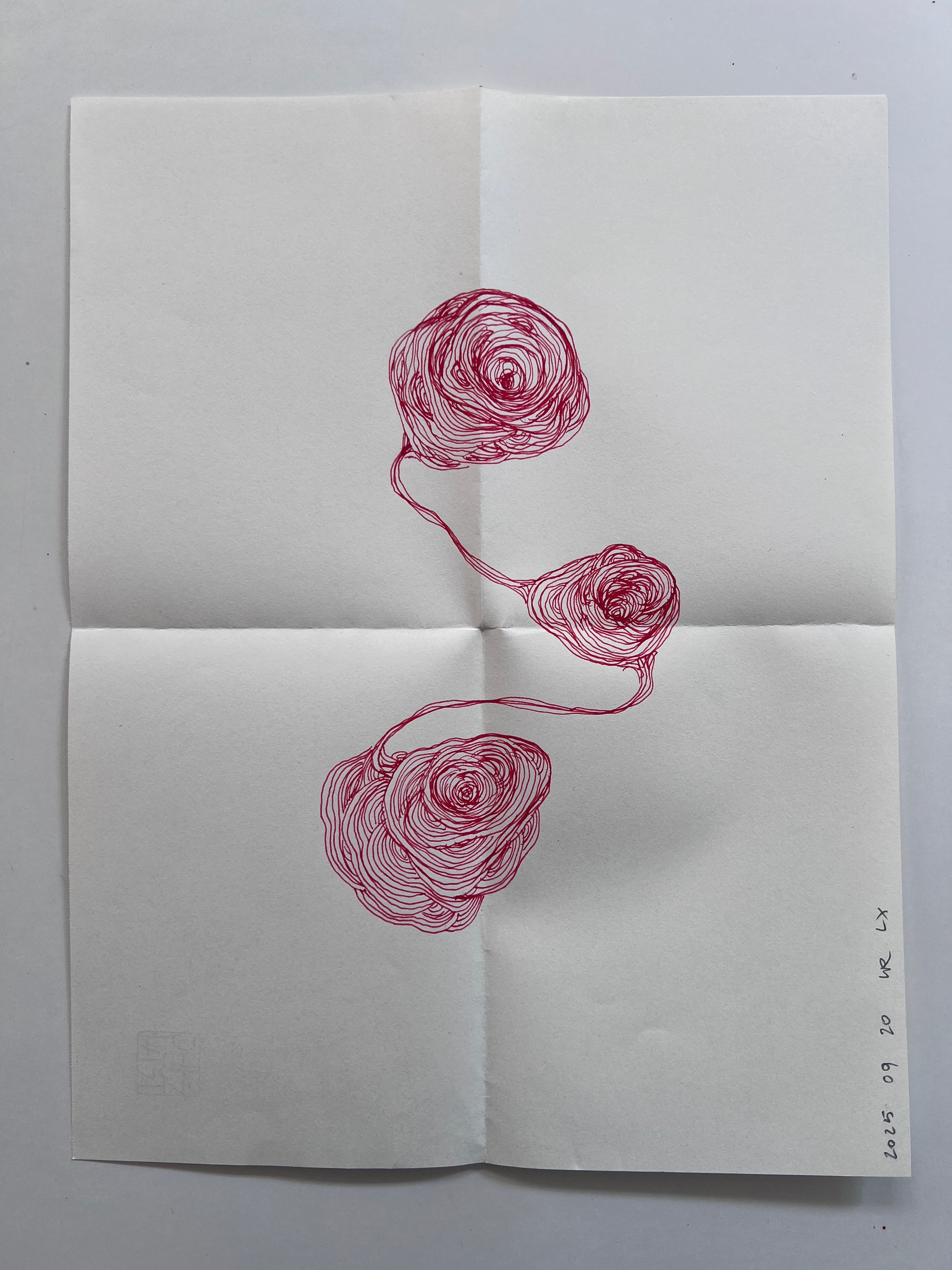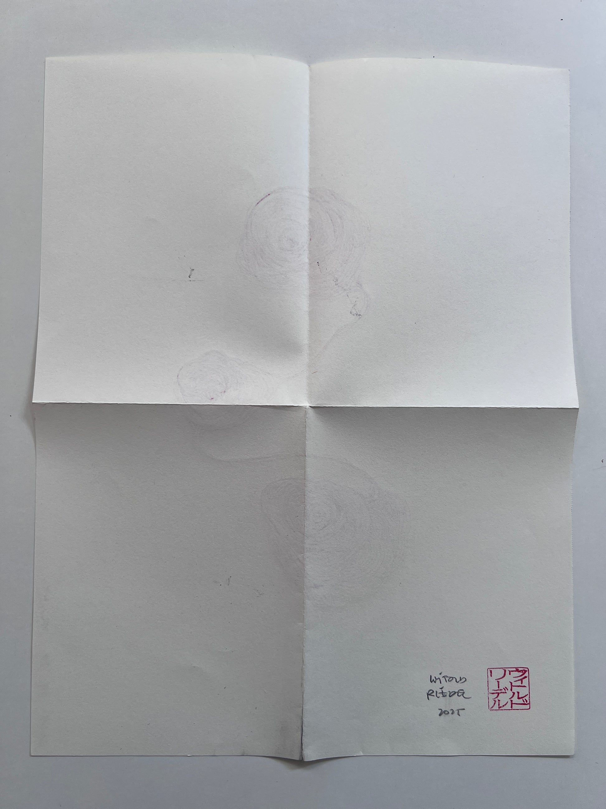 Mail art drawing (36x28cm when open, 18x14cm when mailed) drawn on 100g soft paper using ink. This one is from the most recent mail art series.