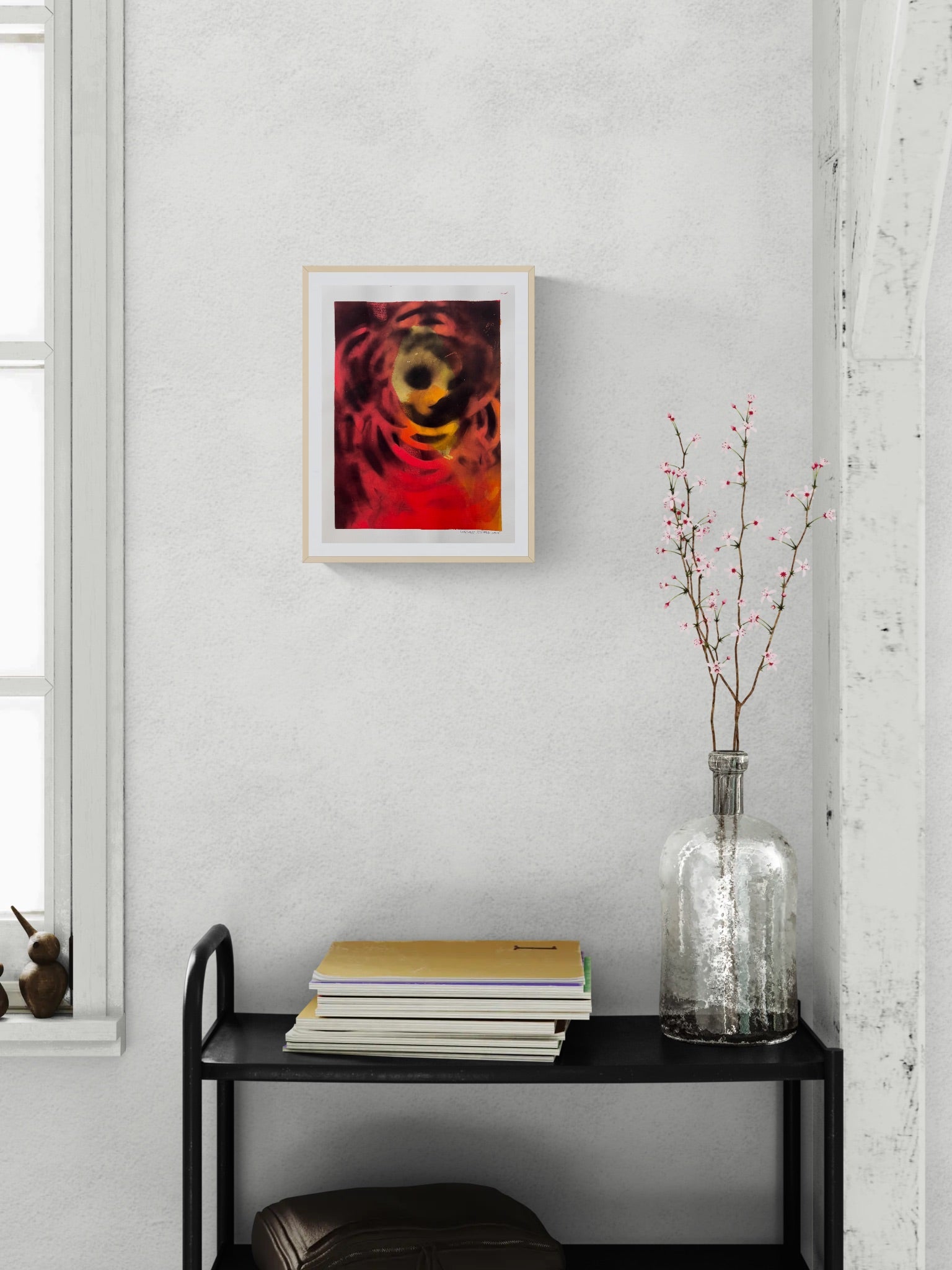 Each piece begins as a watercolour drawing, then is exposed to rising smoke from a kerosene flame. The soot, or 300 year old particles, reaches the paper through a second, sacrificial drawing that has been cut out. This intermediary sheet is slowly destroyed in the process, leaving only its traces and shadows. Soot and combustion particles settle directly onto the watercolour and grow a smoky drawing over the colour beneath, a kind of particle photogram made not with light but with ancient fossil carbon. Some pieces carry small scorch or burn marks where the smoke briefly ignited the paper, a visible memory of the heat that formed them.